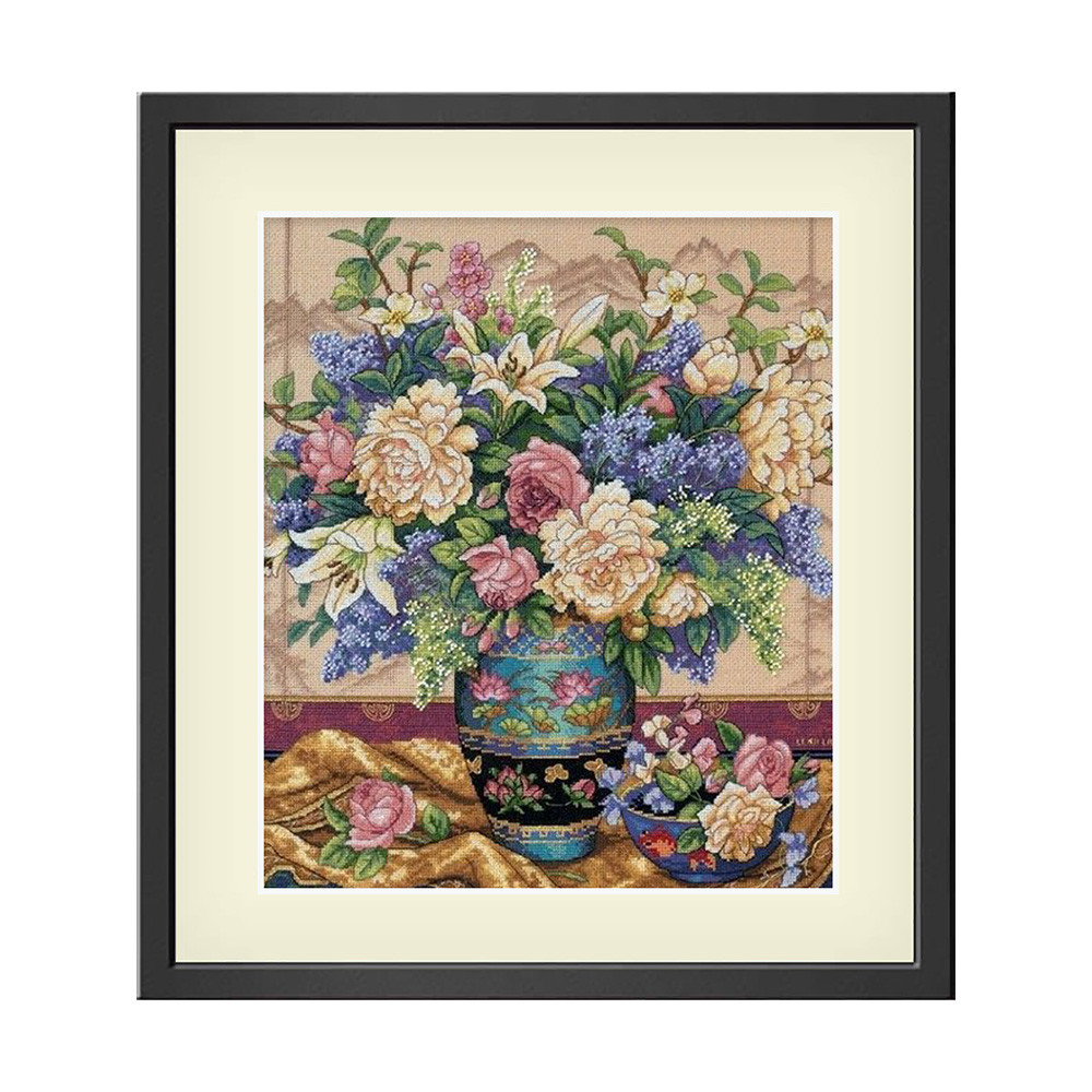 Созерцая красоту цветов, вы перенесетесь в атмосферу Востока. Картина выполнена в роскошных оттенках с акцентами из золотых металлизированных нитей.