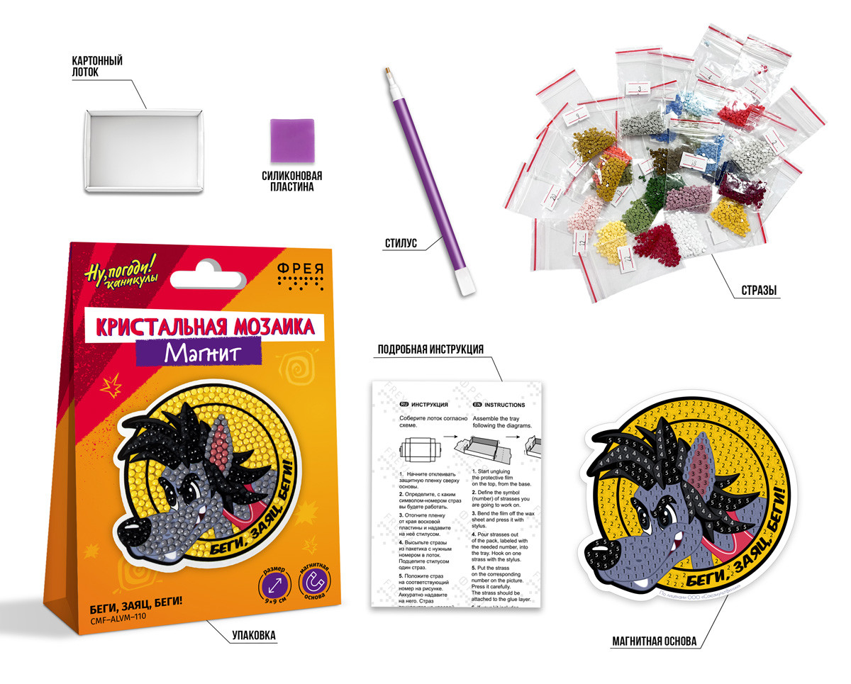 Добро пожаловать в мир волшебства и ностальгии с коллекцией наборов в технике " Кристальная мозаика", созданных по анимационным шедеврам студии " Союзмультфильм". Миллионы людей выросли на захватывающих приключениях любимых героев. Эти персонажи стали частью вашего детства, а теперь они могут украсить вашу повседневную жизнь. Набор, сертифицированный для детского творчества, для создания яркого магнита. Рекомендованный возраст: 7+. Выполнение работы не требует специальных навыков, выкладывать изображение очень просто и легко. Стразы наклеиваются поверх изображения со схемой на уже нанесенный клеевой слой. Набор ТМ ФРЕЯ комплектуется всеми необходимыми материалами: - магнитная основа с клеевым слоем и защитной плёнкой, - круглые стразы: 5 цветов, с запасом более 30%,,- картонный лоток, - стилус и восковая подушечка,- инструкция. Тип выкладки: частичнаяУровень сложности: 1 из 3Размер готового изделия: 9 х 9 смРазмер упаковки: 10. 5х2. 5х14. 5 см. Продукция соответствует требованиям ТР ТС " О безопасности игрушек". Сообщить о неточности в описании