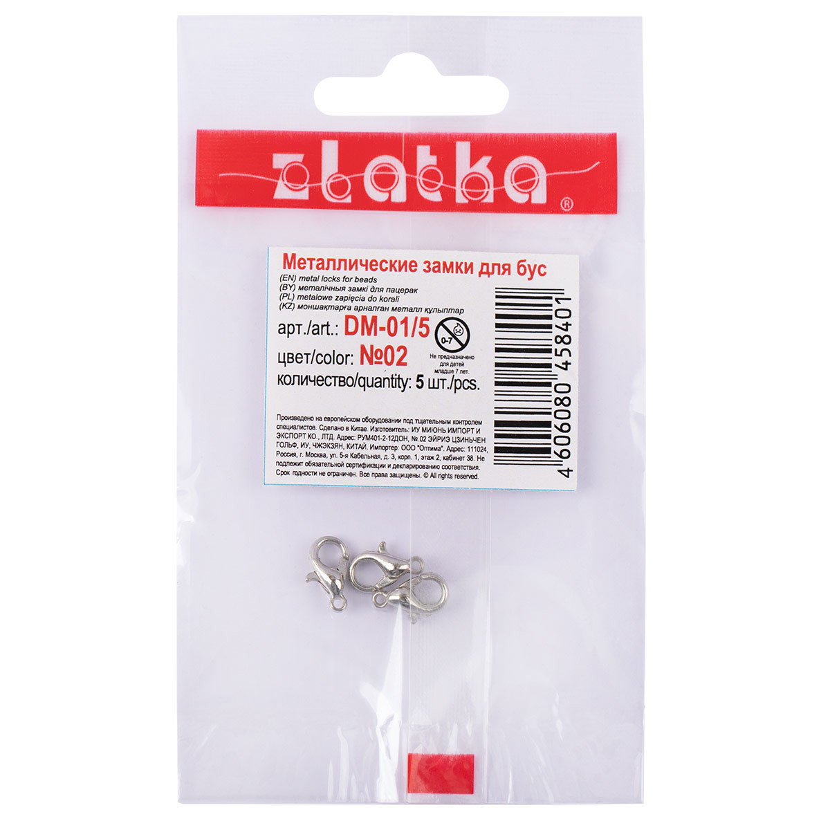 Замок для бус " карабин" малый " Zlatka" DM- 01/ 5 Замочки - это вид фурнитуры для бижутерии, используемой для застегивания браслетов, бус и колье. Карабины - самый распространенный вид застежек. Для использования понадобится ответная часть на украшении: петелька концевика, соединительное колечко, цепочка- удлинитель или другой декоративный элемент. Могут также устанавливаться вместе с удлиняющей цепочкой, что позволит легко изменять длину украшения в пределах нескольких сантиметров. Отличается прочностью, легкостью использования. Длина 10 мм. К карабину подходят кольца арт. R- 05Сплав свинца и цинка. Сообщить о неточности в описании